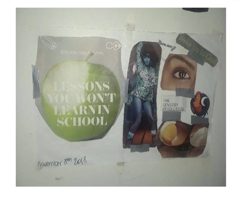 the vision board has: an apple that reads “lessons you won’t learn in school”, text that reads “wake up to craft”, text that reads “the sensory revolution”, a femme presenting person dancing freely, an eye, a cracked egg, a rooster and a crescent moon.