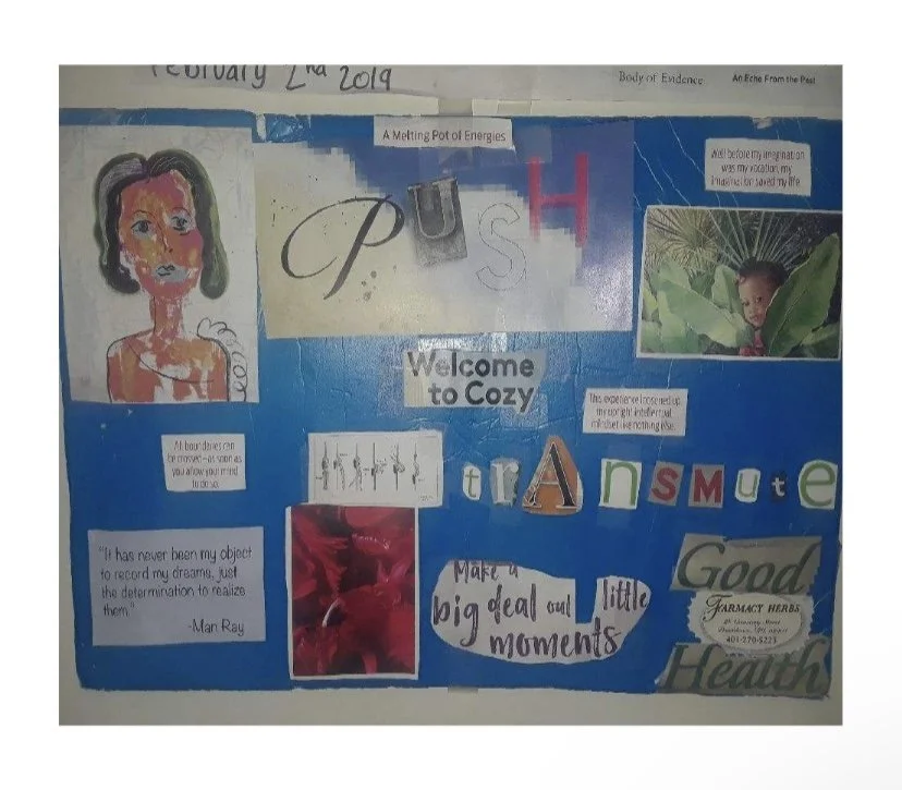the vision board has: a watercolor painting of a femme with dark hair, text that reads “a melting pot of energies”, text that reads “melting pot of energies”, text that reads “welcome to cozy”, text that reads “good health”, Farmacy Herbs, a picture of someone pole dancing, text that reads" “make a big deal out of little moments”, text that reads ”transmute”, text that reads “this experience loosened my uptight, intellectual, mindset like nothing else”, text that reads “before my imagination was my vocation, my imagination saved my life”, text that reads “all boundaries can be crossed as soon as you let your mind do so”, a quote that says “it has never been my object to record my dreams, just the determination to realize them - Man Ray”