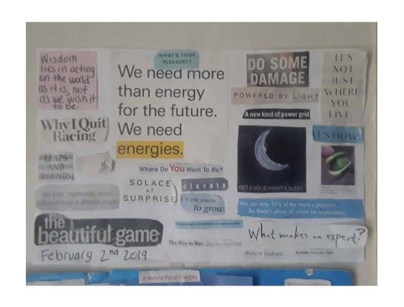 the vision board has: a crescent moon with text that says “get a solids night sleep”, text that says “do some damage”, text that says “powered by light”, text that says “its not just where you live, it’s how”, text that says “a new kind of power grid”, text that says “what makes an expert?”, text that says “echo from the past”, text that says “body of evidence”, text that says “we need more than energy for the future, we need energies”, text that says “wisdom lines in acting on the world as it is, not as we wish it to be”, text that says “why I quit racing?”, text that says “where do YOU want to be?”, text that says “I want room to grow”, text that says “ways to win: juju on the field”, text that says “solace at surprise”, text that says “convenient connections to every match”, text that says “solace at sunrise”, text that says “engineering means different things to different people”, text that says “a beautiful game”